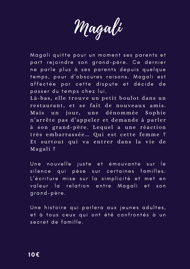 Une nouvelle juste et émouvante sur le silence qui pèse sur certaines familles. L’écriture mise sur la simplicité et met en valeur la relation entre Magali et son grand-père.
